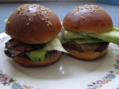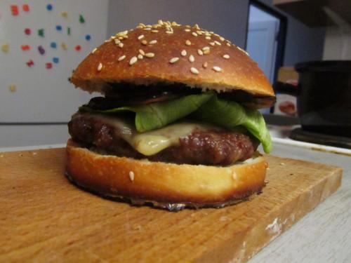 Na náplň jsem použila mleté maso, které jsem lehce osolila a uplácala z něho placky trochu větší než housky. Ty jsem potom upekla v troubě, položila na ně plátek sýra a ještě teplé plnila do housek. Přidala jsem plátek osmažené slaniny, kolečko červené cibule a list ledového salátu. A pak svedla urputný boj o to, že nejprve se fotí a až potom jí.