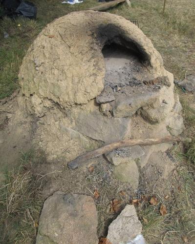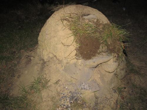 Když bylo pečivo úspěšně uvnitř, zavřeli jsme vstupní otvor i komín kamenem a utěsnili drny.
