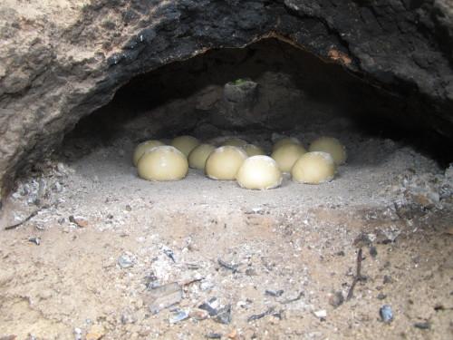 Pak jsme přestali přikládat, rozhrnuli uhlíky ke stranám a nechali celou pec chladnout tak, až jsem do ní víceméně mohla na chvilku strčit ruku a mouka nasypaná doprostřed jen velmi pomalinku tmavla. To byla ta správná chvíle na vsazení pečiva.