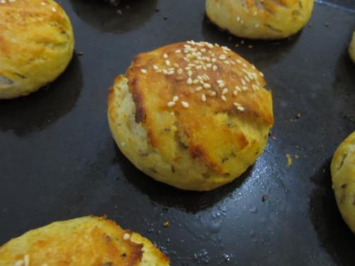Před vložením do trouby jsem každou bulku zakryla plátkem tvrdého sýra. Napoprvé jsem použila eidam. Od té doby jsem je ale pekla už několikrát, takže mám vyzkoušeno, že s uzeným eidamem nebo goudou jsou také vynikající.