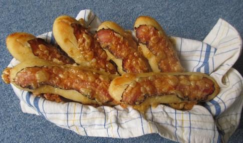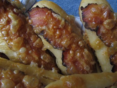 Byla jsem zrovna uprostřed svého sýrového experimentování a v hlavě mi pomalu uzrávala myšlenka vyzkoušet rohlíky, které se dají koupit pod názvem anglické. Netuším, proč se tak jmenují. A taky netuším, proč vždycky, když je někde vidím, dostanu velikááánský hlad. Zásobila jsem se tedy slaninou a sýrem a k večeru zadělala rohlíkové těsto. Manžel přišel večer z práce a nic netuše mi začal povídat o tom, jak bych mohla někdy vyzkoušet upéct takové ty křupavé rohlíky, nahoře se slaninou a sýrem, mňam, mňam, mňam. Měly být zítřejším překvapením, ale nakonec jsem to nevydržela a hned po večeři mu prozradila, že nás dnes honí stejná mlsná.