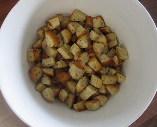 Krutonky se tak osvědčily, že jsem nakonec všechny zbylé tymiánové housky nakrájela, osmažila a nakonec dala ještě pořádně vysušit do trouby. A tím naše pokusy se starým pečivem skončily. I když byly všechny výtvory k snědku, některé dokonce velmi dobré, doufám, že se k nim dlouho nebudu muset vracet. Čerstvé pečivo je přece jenom čerstvé pečivo (pouze krutonky si zase vyrobíme, až dojdou, dokonce mám v plánu speciálně kvůli nim péct housky, ale to zatím prosím nikomu neříkejte).