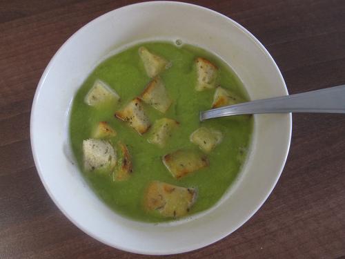 Krutonky jsme si přidávali do jednoduché hráškové polévky, čímž se z ní stala, dalo by se říct, slavnostní hrášková polévka.